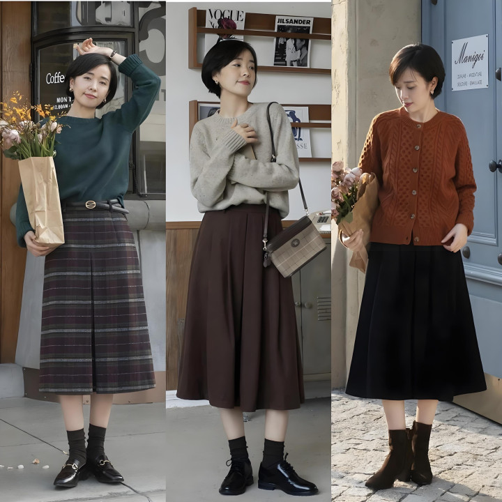 靴子就不一样,它的款式设计本身就带着一点“复古”的时髦劲儿,不像运动鞋那么休闲随性,也不像浅口鞋秋天穿会有些冷。它把这两点更好平衡到了一起,和裙子搭配起来还添了几分温柔淡雅的感觉,特别适合咱们中年女人。