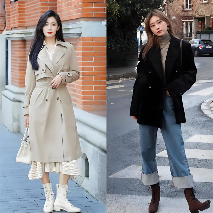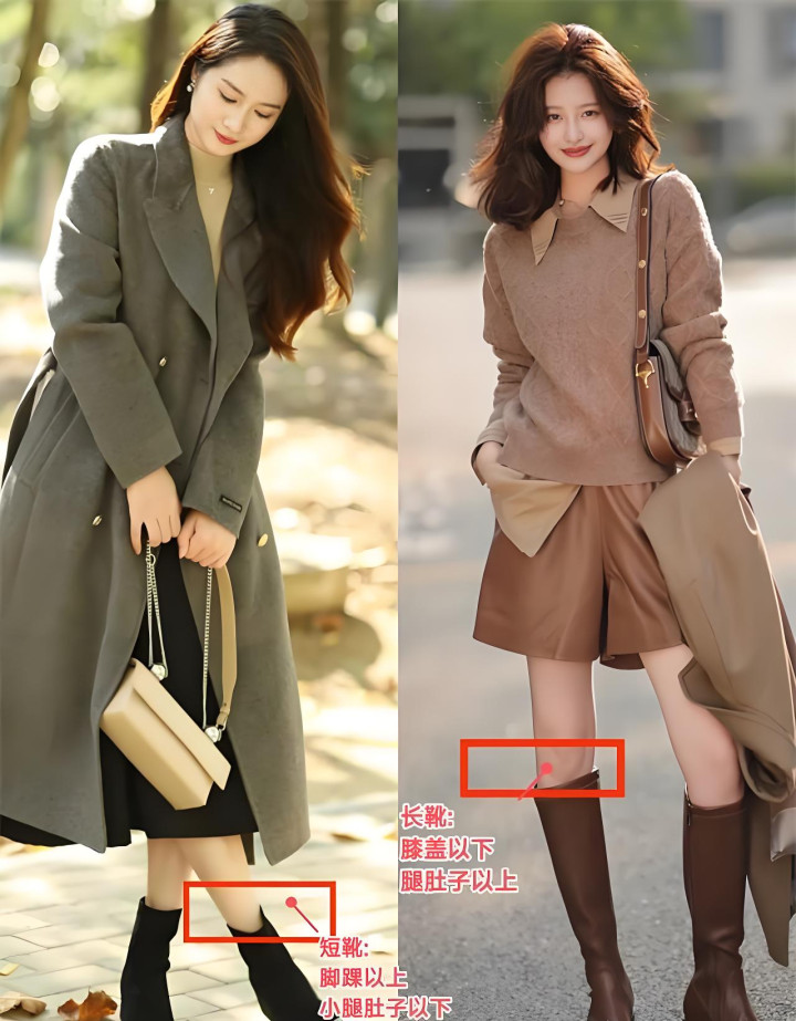 我们应该去选择那些长度超过脚腕的,比方说到脚踝上方3cm左右,或者去选择一双高度直接到膝盖的长筒靴。这两种长度的靴子,能更好地修饰你的腿型,延长腿部的比例,衬得自己整个腿又细又长。