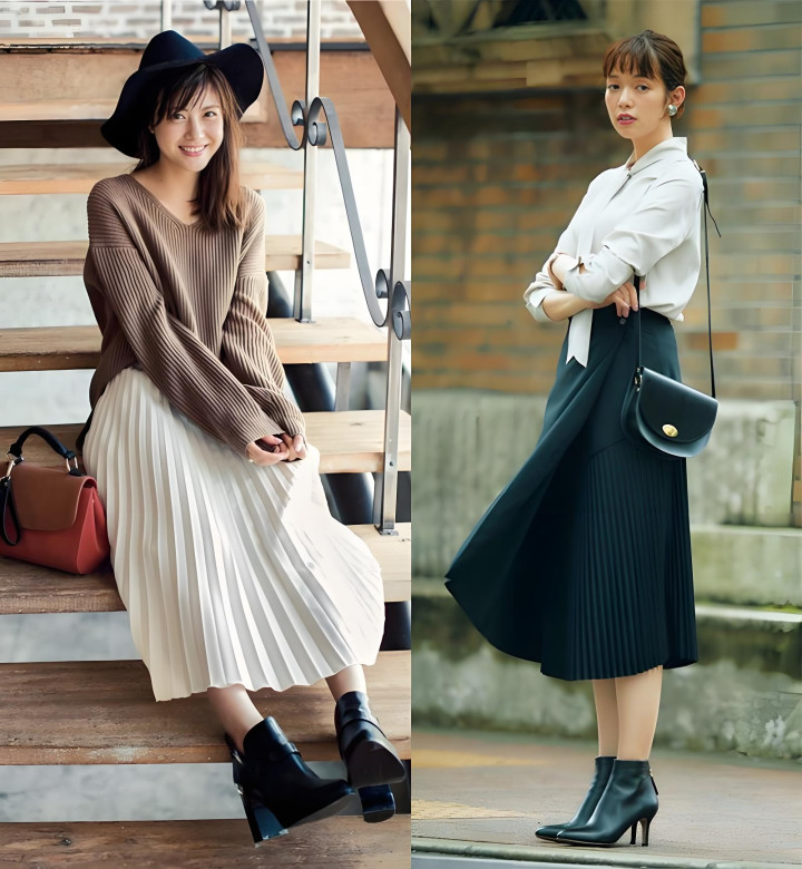最适合我们的裙子长度,应该是在脚踝上方5~10cm的位置,搭配短靴,增加轻盈感的同时,还能把你纤细的小腿线条给露出来。而穿一双长靴,则能增强造型的气场,顺便延伸腿部的线条感。