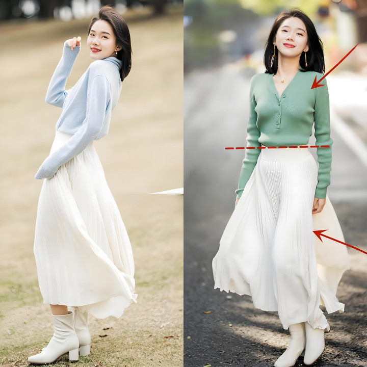我们可以用最简单粗暴的方法,那就是把上衣塞进裙子里,如果你穿的连衣裙,那就直接选择带有收腰设计的款式。