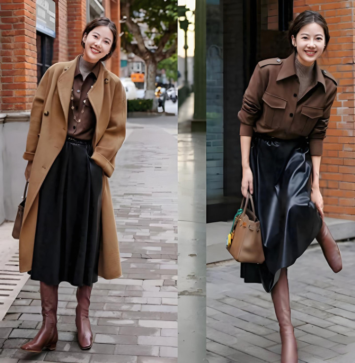 你像图片中的博主,穿了一身棕色的大衣和衬衫,下身又搭配了一条黑色裙子,她就选择了以棕色为主色调,穿同一种颜色的靴子和衣服的颜色相呼应。